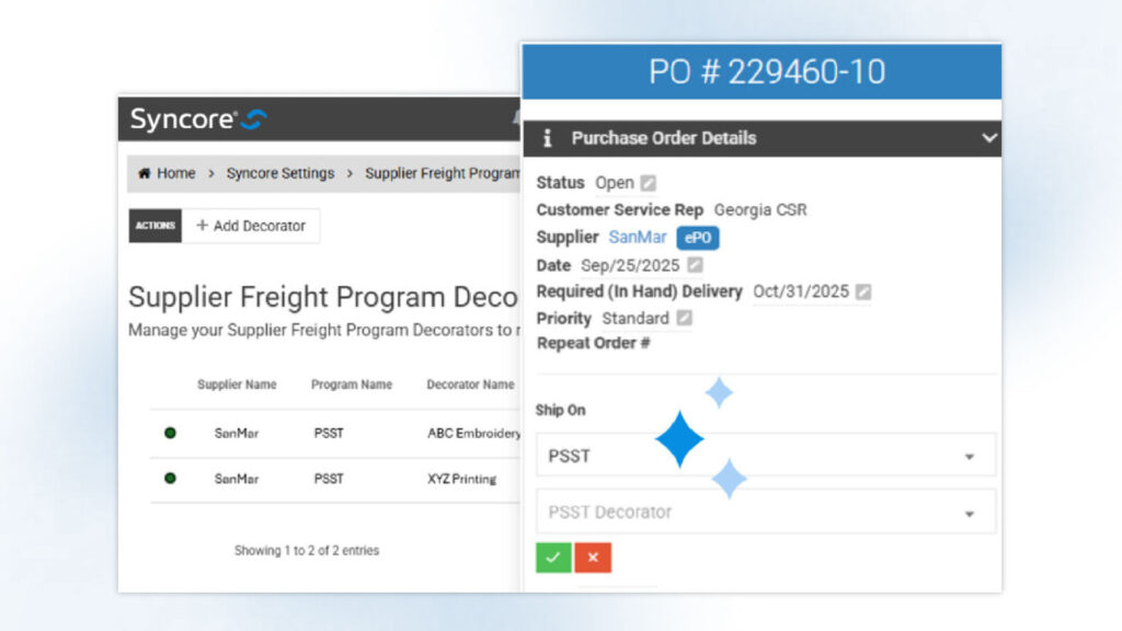 Fall ePO updates introduced pre-populated decorator lists, allowing customer service teams to ensure address accuracy and eliminate freight charge errors for PSST orders with suppliers like SanMar. Orders moved faster, with fewer delays and significantly fewer data errors.