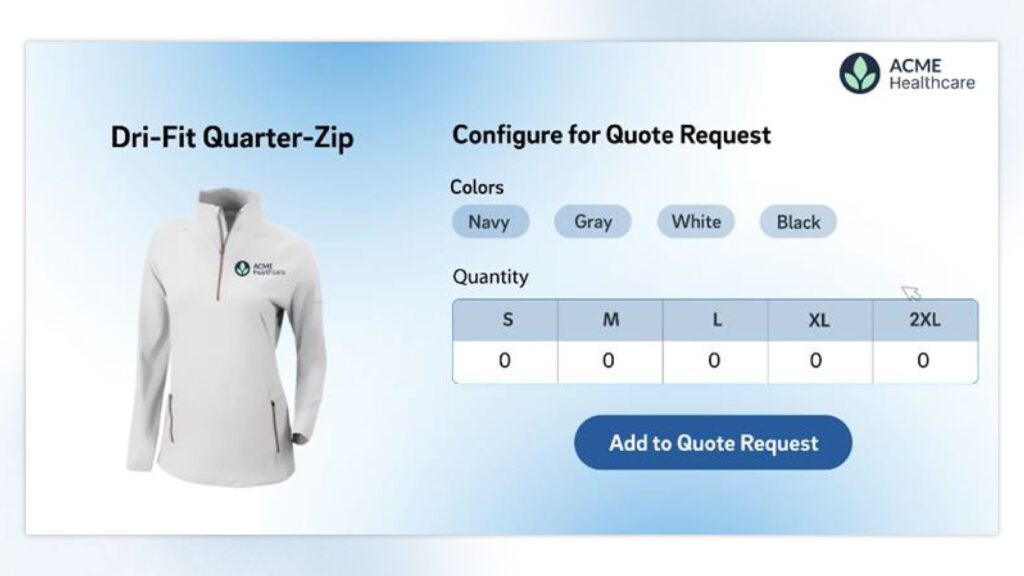 In the Proposal process, clients can request a quote with all the detailed information needed without sales intervention. They can select products, colors, sizes, and quantities right in the live Proposal, making it a key tool to keep the sales process moving and giving clients the self-service option they want.